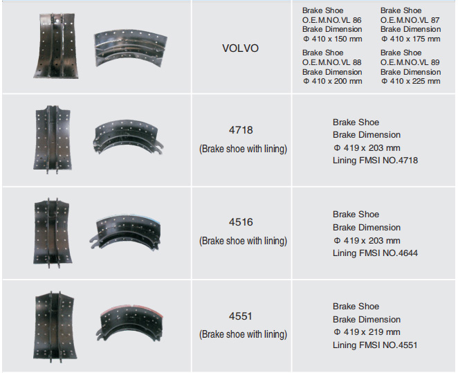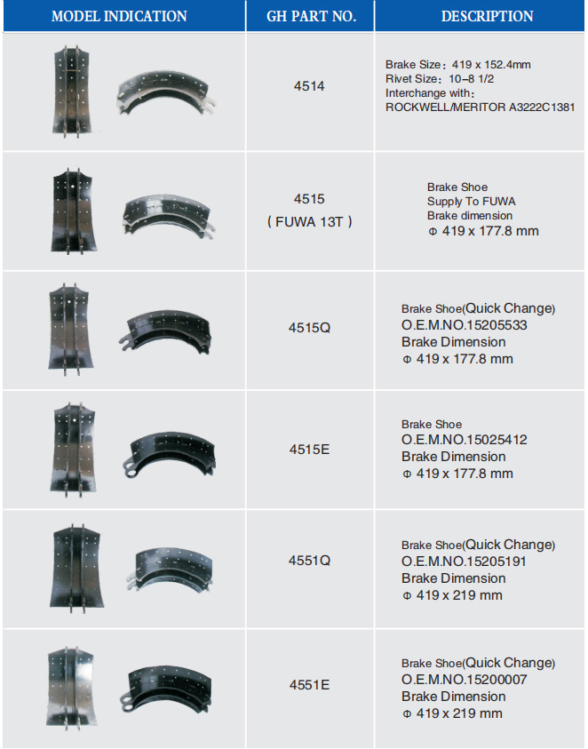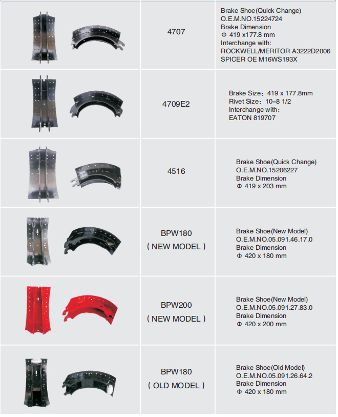 制动蹄与对应刹车片型号